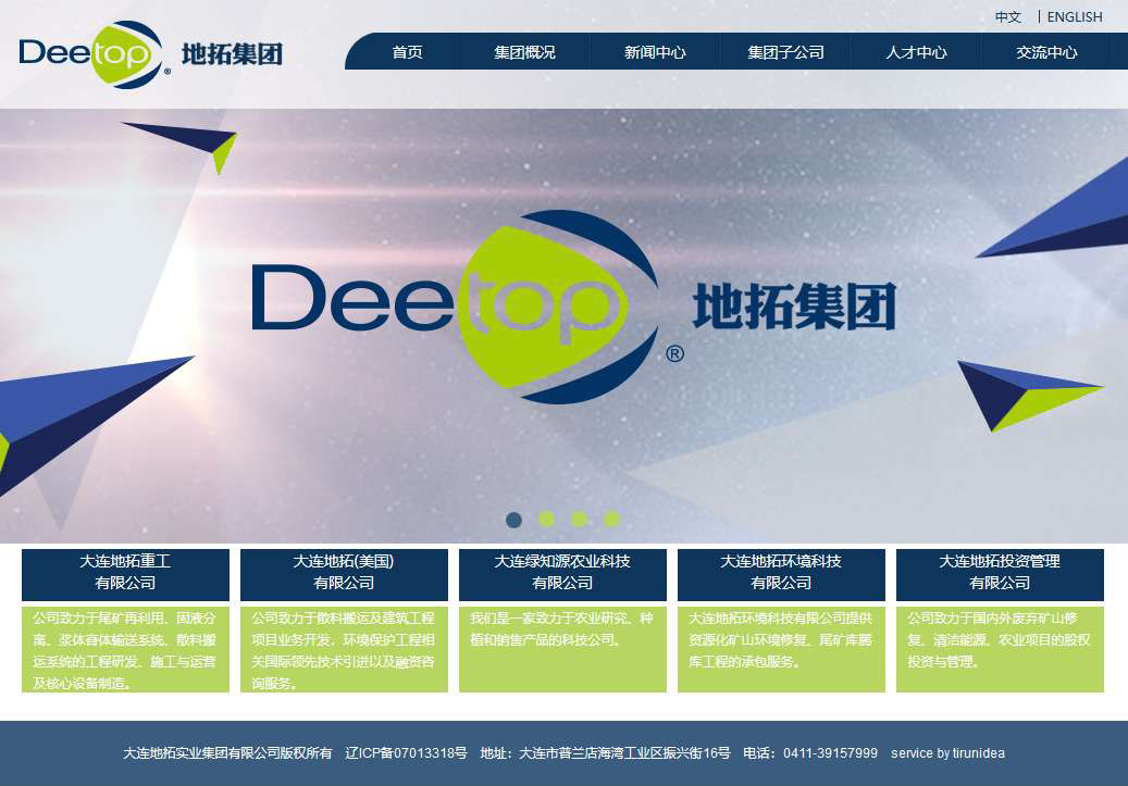 大(dà)連地拓實業集團有(yǒu)限公司是一家(jiā)民營股份制(zhì)企業集團,總部位于大(dà)連市普灣新區(qū),共有(yǒu)員工700餘人(rén)。旗下共有(yǒu)5家(jiā)控股公司,分别是大(dà)連地拓重工有(yǒu)限公司,大(dà)連盛功建設工程有(yǒu)限公司,大(dà)連地拓汽車(chē)裝備有(yǒu)限公司、遼甯天怿環境保護有(yǒu)限公司和(hé)大(dà)連地拓投資管理(lǐ)有(yǒu)限公司。業務涵蓋礦山(shān)、電(diàn)力、港口、汽車(chē)、環保、市政工程和(hé)礦産資源投資與貿易等領域。