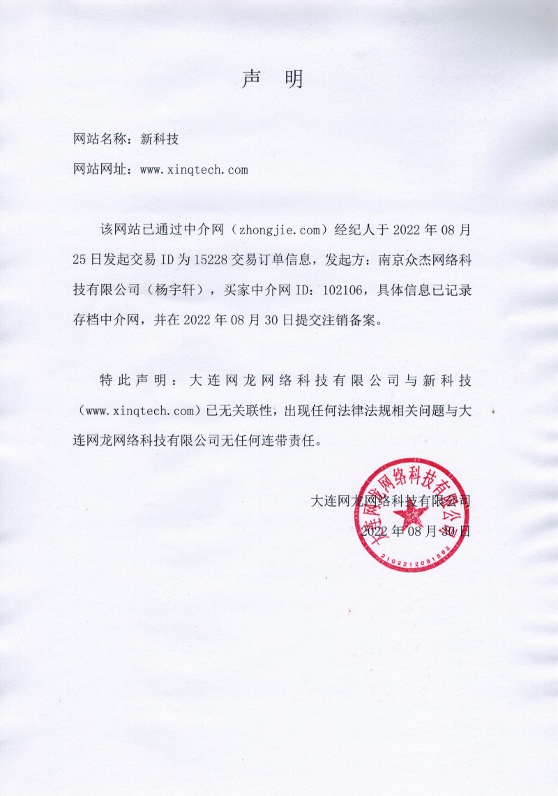 特此聲明(míng):星傳網視(大連)網絡科技有限公司與新科技(jì)(www.xinqtech.com)已無關聯性,出現任何法律法規相關問題與星傳網視(大連)網絡科技有限公司無任何連帶責任。